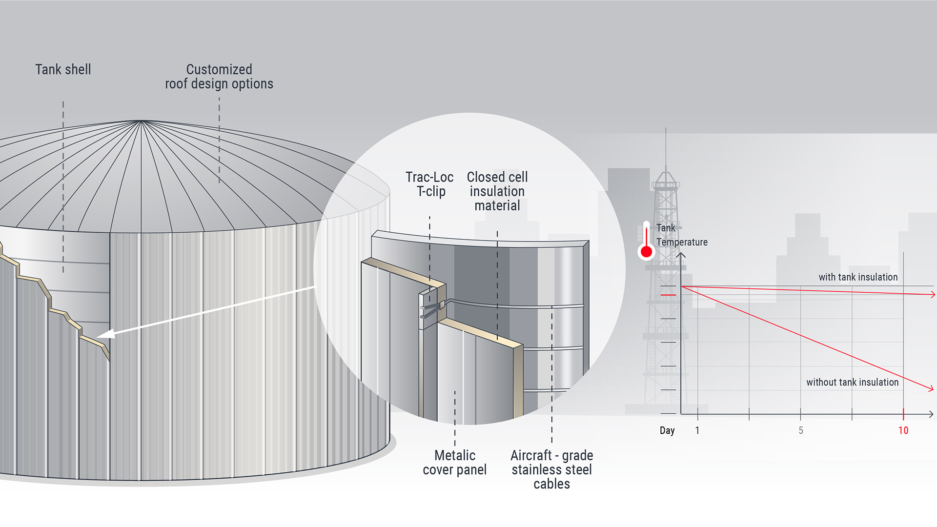 凍脹防護系統可防止低溫儲罐地面下形成冰體。冰體形成會導致許多問題,例如不必要或失控的儲罐移動或升高。可通過在低溫儲罐周圍應用保溫層,和通過將電伴熱線應用到儲罐下面的混凝土層,來防止凍脹